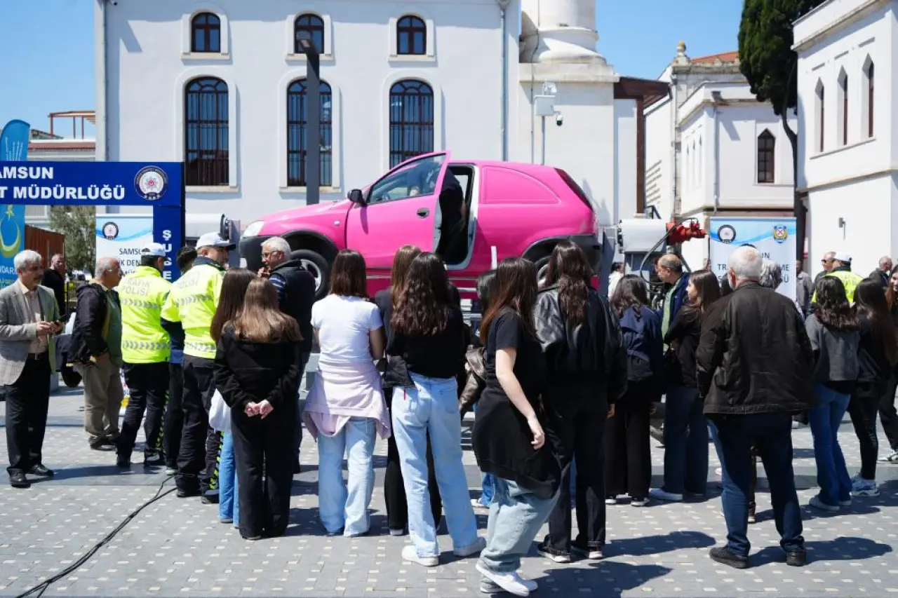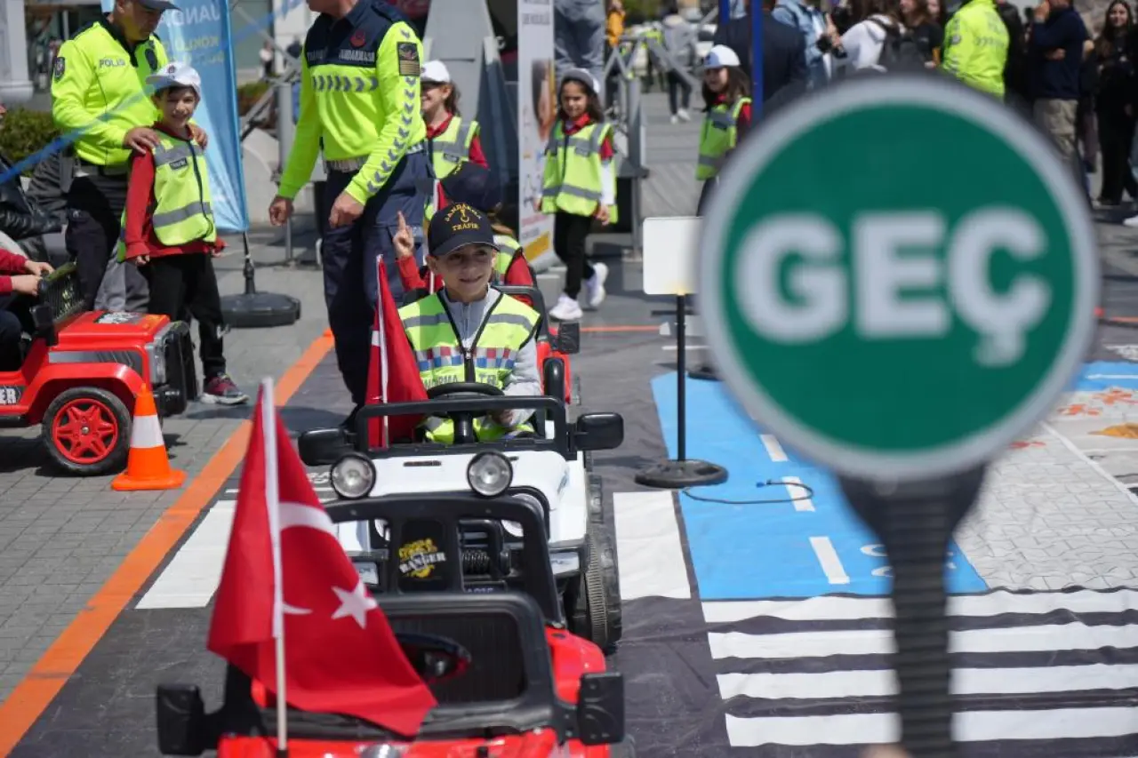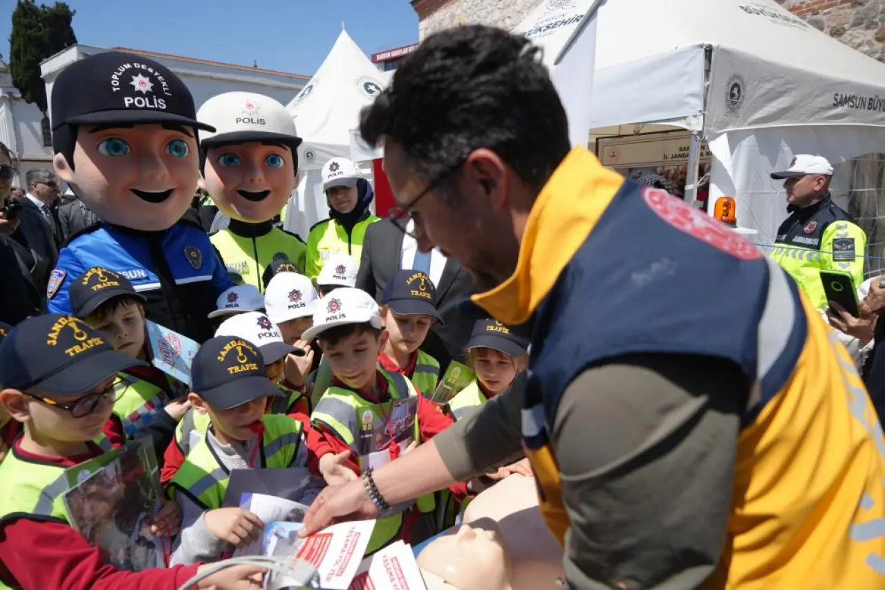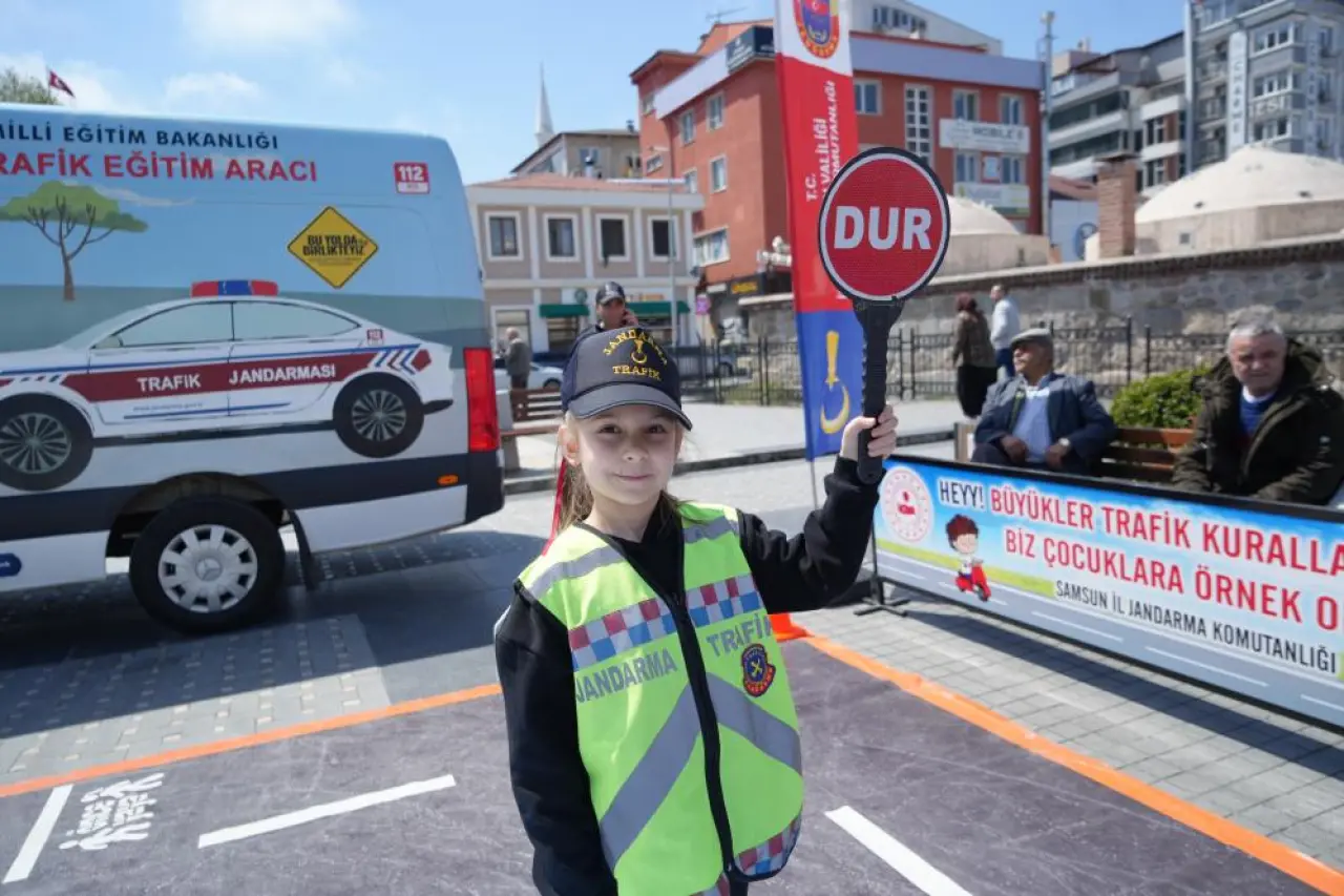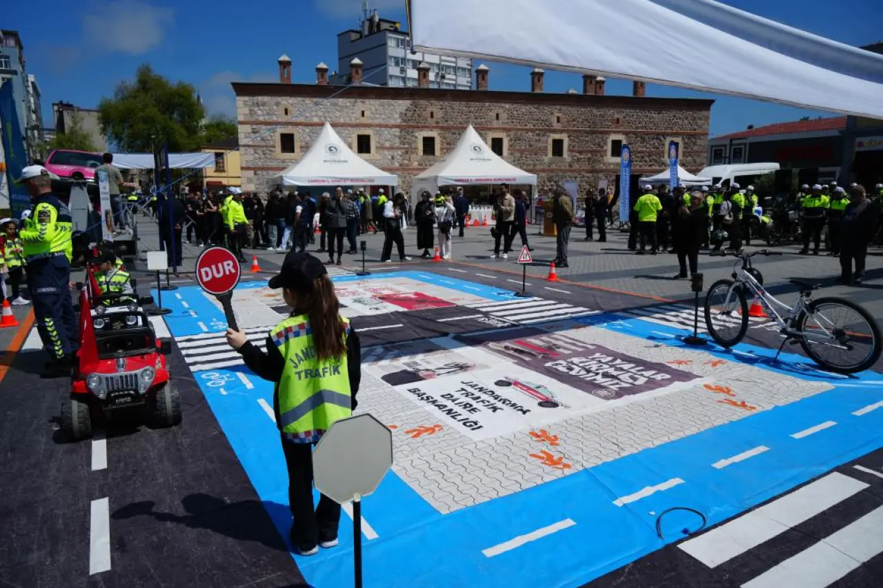 Samsun'un Saathane Meydanı'nda kurulan ekinlik alanında “Trafik Eğitim Halısı” üzerine yerleştirilen yaya geçitleri, trafik levhaları, kavşaklar ve ışıklı sinyalizasyon sistemleriyle donatılan parkurda çocuklar, akülü araçlarla kurallı sürüş yaptı. Polis ve jandarma şapkası ile yeleklerini giyen minikler, gerçek bir trafik ortamını deneyimleyerek kuralları pekiştirdi.