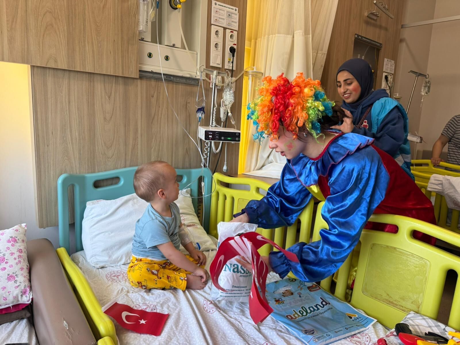 Hastanenin çocuk servisinin duvarlarına çizgi film kahramanlarının resimlerini çizen üniversite öğrencileri, daha sonra palyaço kıyafeti giyerek çocukları eğlendirdi.