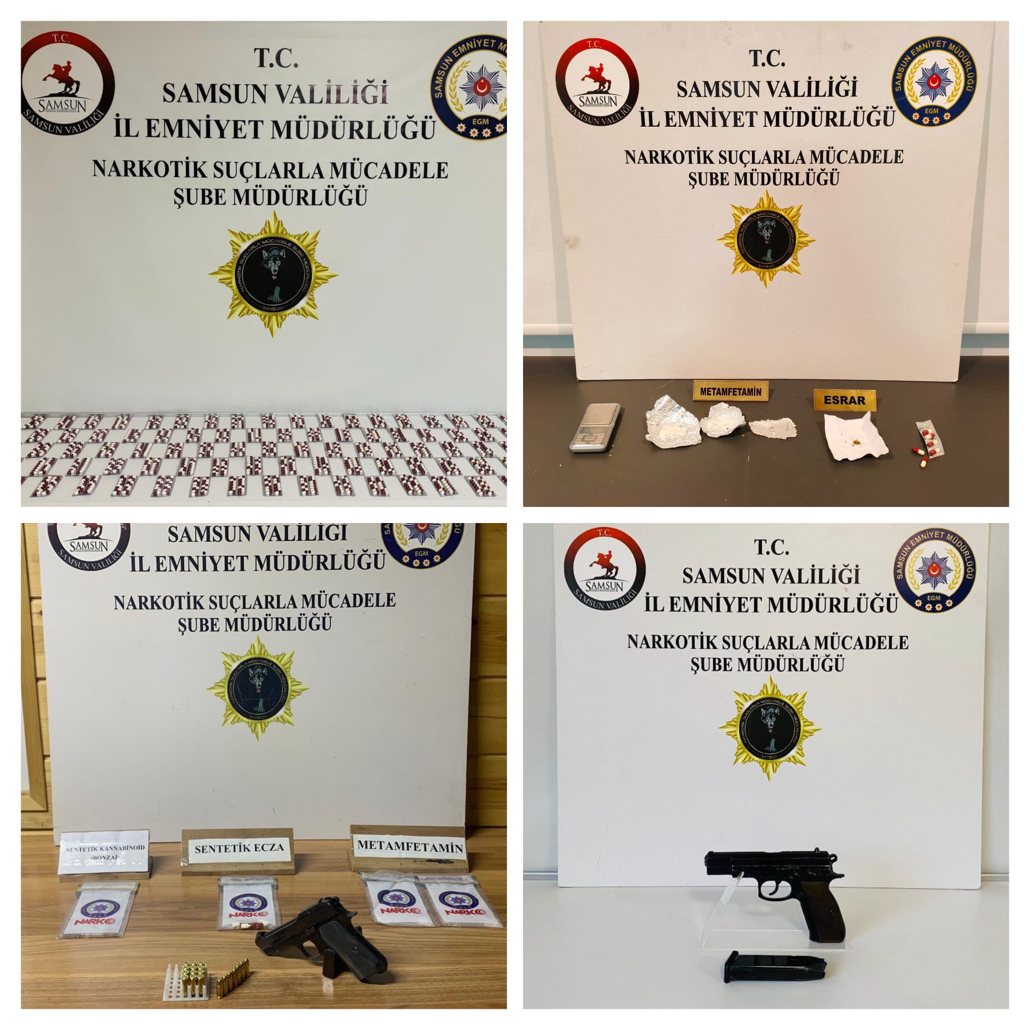 Belirlenen adreslerde yapılan aramalarda 1296 uyuşturucu hap, 14,54 gram sentetik uyuşturucu, 5,62 gram esrar, hassas terazi, uyuşturucu kullanma aparatı, 2 ruhsatsız tabanca ve 19 tabanca fişeği ele geçirildi.