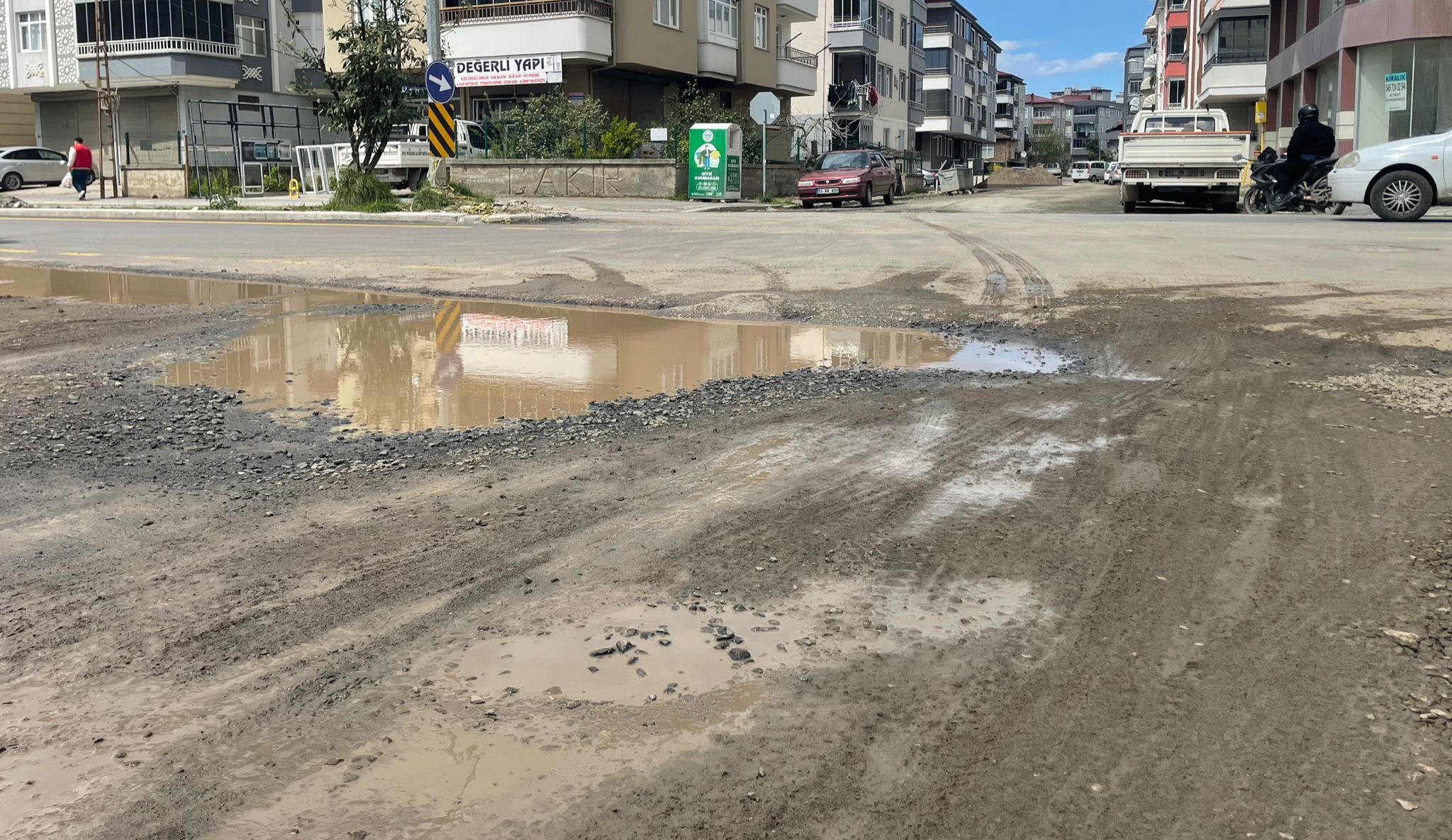 Samsun’un Çarşamba ilçesi Kirazlık Çay Mahallesi Limon Sokak’ta 8 Nisan Çarşamba günü etkili olan sağanak yağışların ardından yolda gölet ve çukurlar oluştu. Oluşan çukurlar, hem araç hem de yaya trafiğini olumsuz etkiliyor. Yağış sonrası yolda oluşan gölet ve çukurlar nedeniyle araç sürücüleri geçişlerde güçlük yaşıyor. Özellikle alçak araçların alt kısmı çukurlara çarpabiliyor ve bu durum araçların zarar görmesine yol açabiliyor. Su birikintileri, araçların geçişini yavaşlatıyor ve araçların kirlenmesine sebep oluyor.