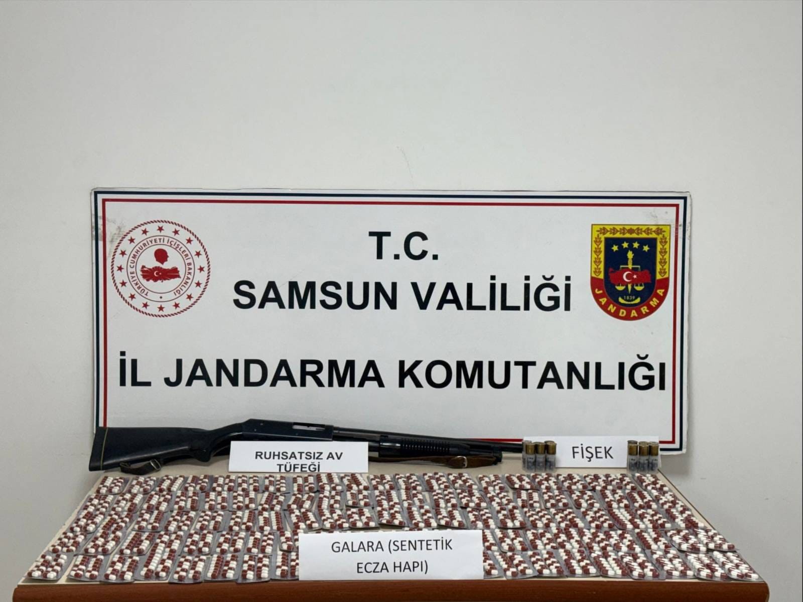 Yapılan aramalarda bin 500 adet sentetik ecza hap ve 1 adet ruhsatsız av tüfeği ele geçirildi. Olayla ilgili gözaltına alınan şahıslar hakkında adli işlemler başlatıldı.