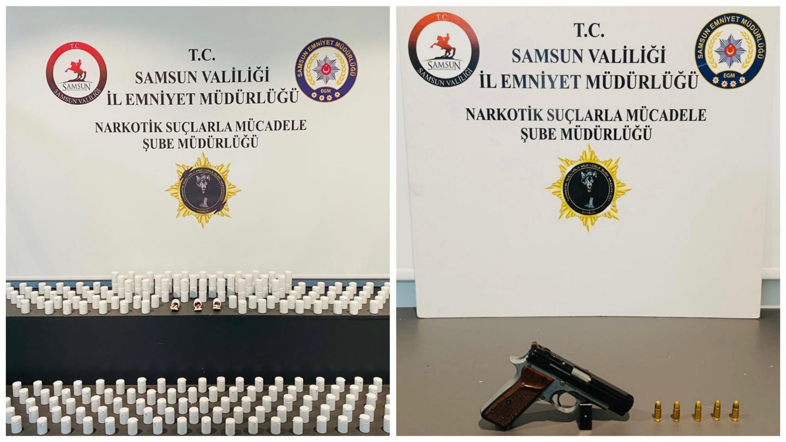 Yapılan aramalarda toplam 9 bin 308 adet sentetik ecza, 1 adet ruhsatsız tabanca ve 5 adet fişek ele geçirildi.