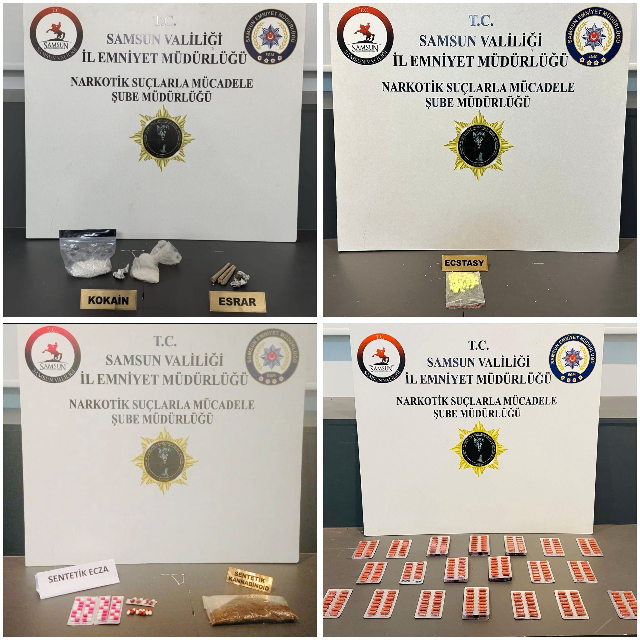 Gerçekleştirilen üst, araç ve ikamet aramalarında, 4 şüpheliye ait olduğu değerlendirilen 103,52 gram kokain, 60 gram sentetik kannabinoid, 51 adet ecstasy hap, 81 adet sentetik ecza, 3,92 gram skunk, 0,62 gram esrar, 3 adet esrarlı sigara, 1 hassas terazi ile 2 uyuşturucu kullanım aparatı ele geçirildi.