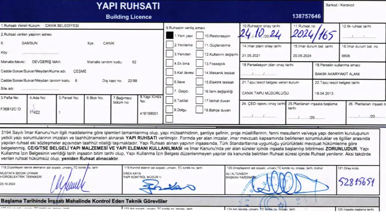 İstasyonun içinde yer alan yıkama alanının ruhsatına ilişkin ortaya atılan iddialara da yanıt veren Şener, "Buraya muhtemelen sonradan eklenen yıkama alanı, ruhsata işlenmese bile vaziyet planında mutlaka yer alaması gerekir" açıklaması yaptı. Öte yandan Samsun Büyükşehir Belediyesi CHP Meclis Üyesi Hasan İpek ise Canik Belediyesi'nin 24 Ekim 2024 tarihli akaryakıt istasyonunda yapılan bir tadilata ilişkin işletmeye verdiği yapı ruhsatını paylaştı.