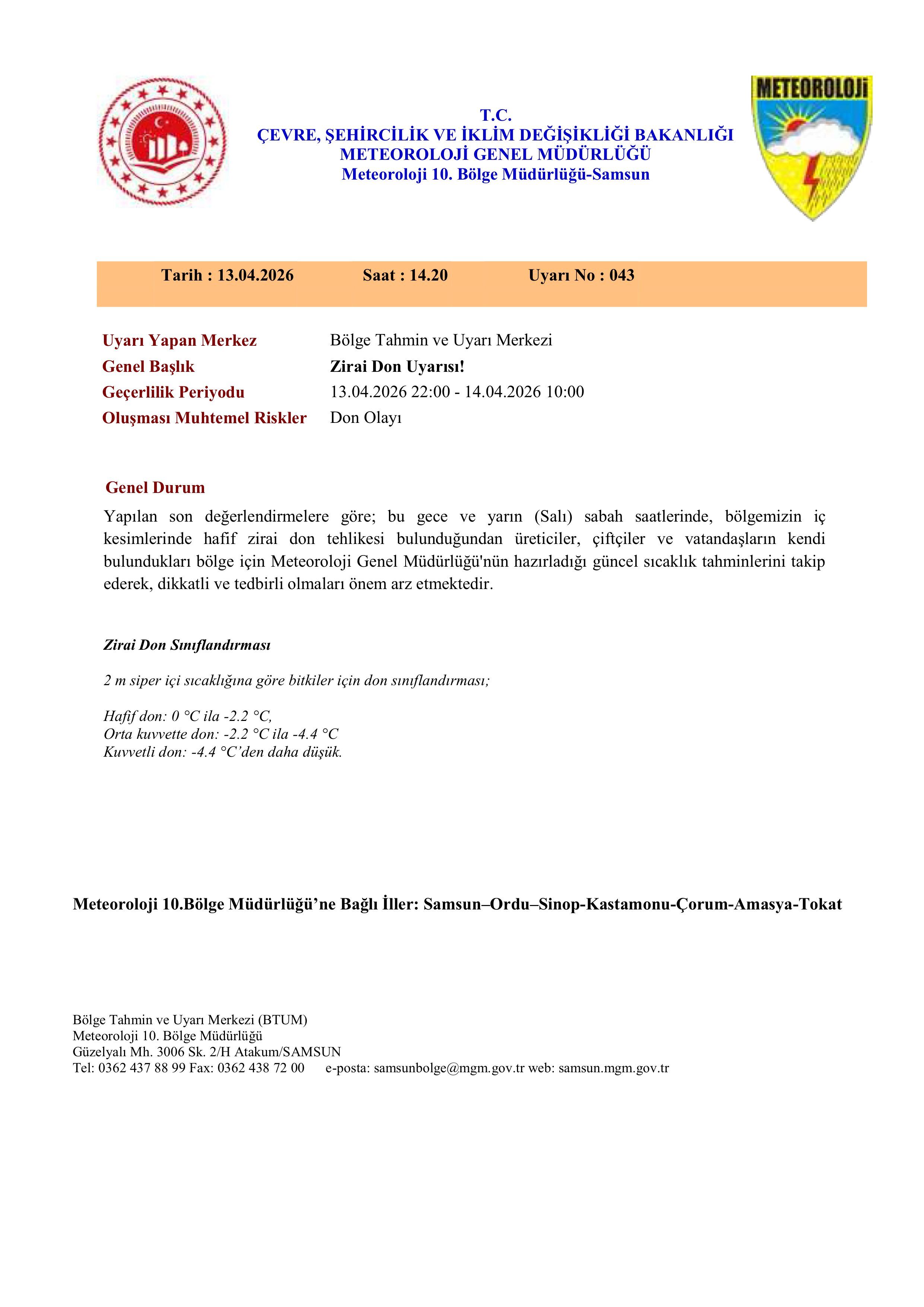 Bölge Tahmin ve Uyarı Merkezi tarafından yapılan son değerlendirmelere göre, 13 Nisan gecesi saat 22.00 ile 14 Nisan sabahı saat 10.00 arasında zirai don tehlikesi öngörülüyor. Özellikle Samsun'un iç kesimlerini kapsayan bu uyarıda, tarımsal faaliyetlerin olumsuz etkinlenmemesi için dikkatli olunması gerektiği bildirildi.