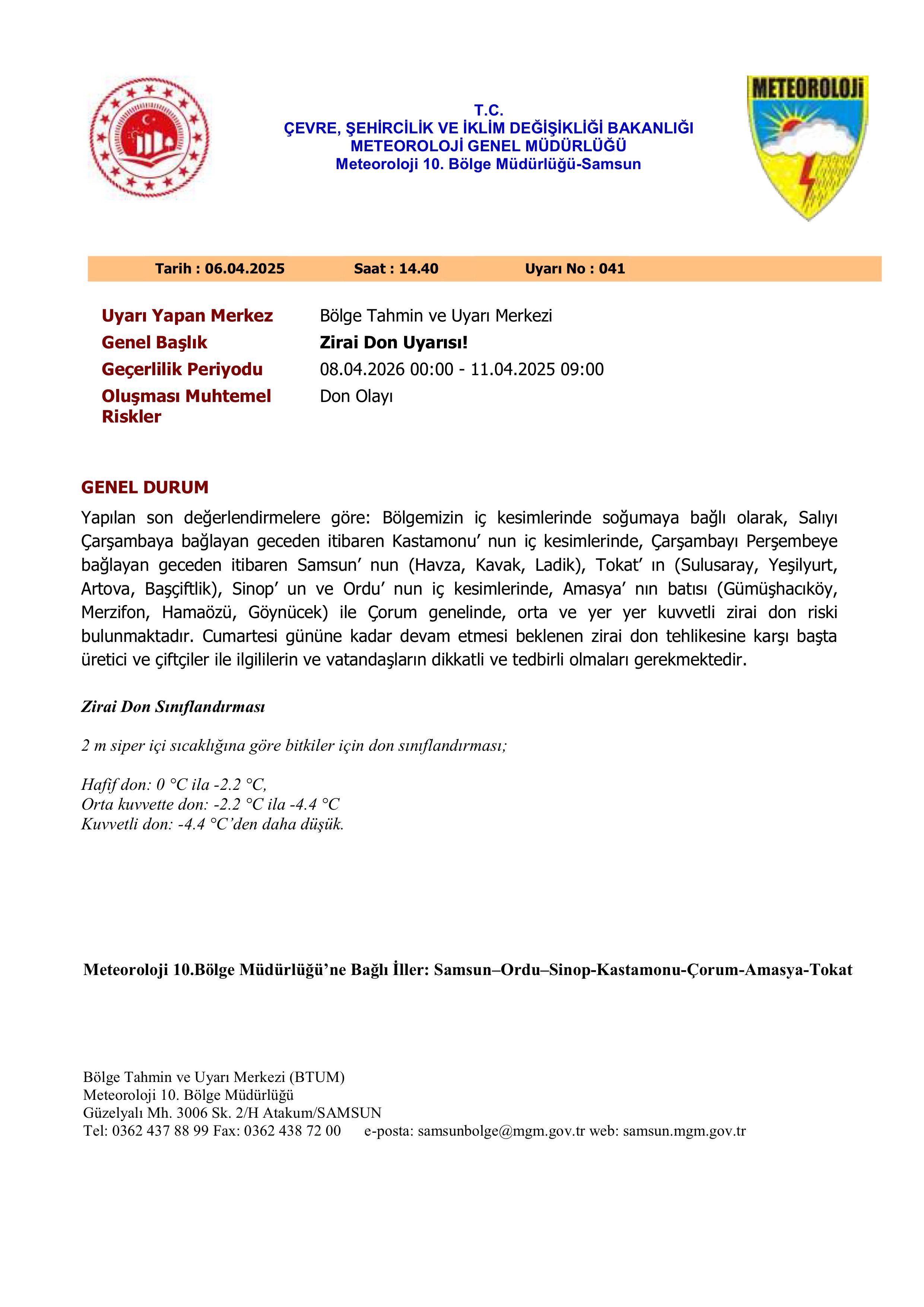 Uyarıya göre, başta Samsun olmak üzere Kastamonu, Tokat, Sinop ve Ordu’nun iç kesimlerinde; ayrıca Amasya ve Çorum genelinde orta ve yer yer kuvvetli zirai don bekleniyor.