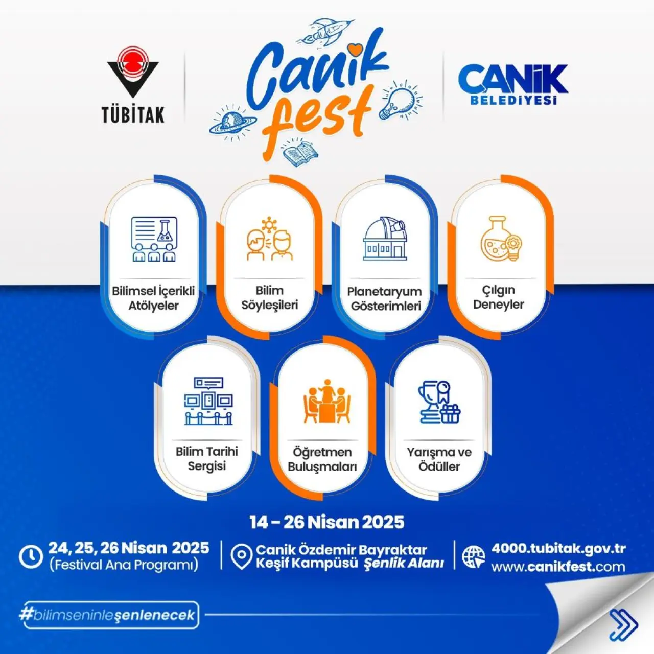 CANİKFEST çerçevesinde 14 - 22 Nisan 2025 tarihlerinde Samsun'un 17 ilçesindeki ilkokul, ortaokul ve liselerde bilim söyleşileri, bilim tarihi sergileri ve planetaryum gösterileri yapılacak. 24, 25 ve 26 Nisan 2025'te Canik Özdemir Bayraktar Keşif Kampüsü'nde yapılacak olan ana festival programı kapsamında ayrıca, Samsun'da yapılan üniversitelerde öğrenimlerine devam eden öğretmen adaylarına ilişkin branşlarında örnek çalışmalar yapan eğitimcilerin katılımı ile söyleşi programları yapılacak.