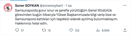 "Samsunsporda gurur onur ve şerefle yürüttüğüm Genel Müdürlük görevinden bugün itibarıyla Yüksel Başkanımızada bilgi verip bize ve Samsunspora kattıkları için teşekkür ederek ayrılmış bulunmaktayım. Hakkınınızı helal edin." ifadesine yer verdi.