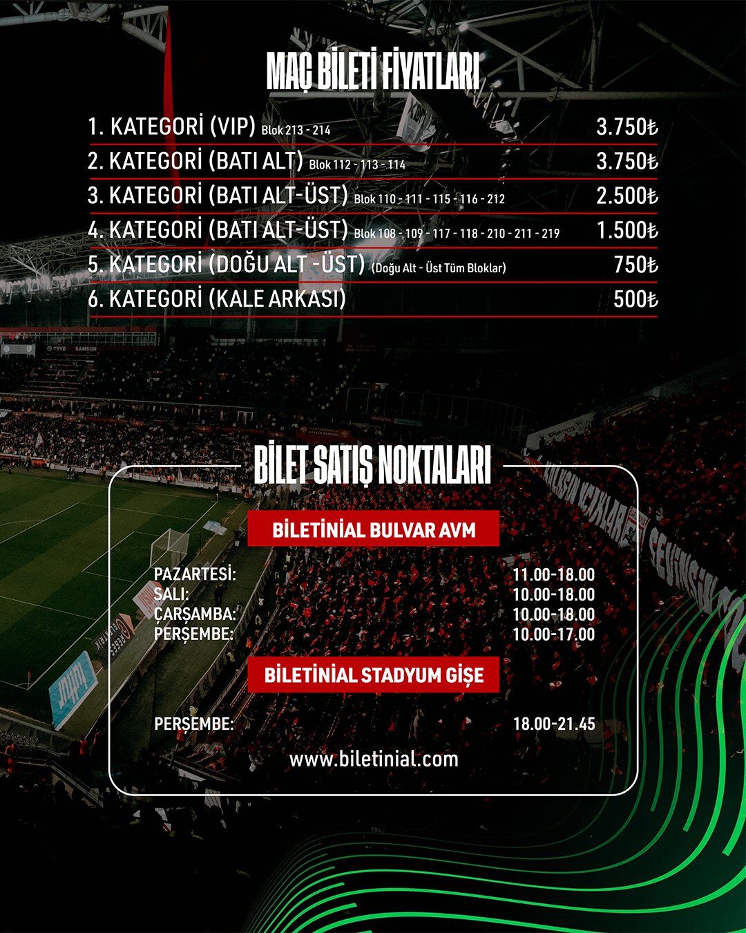 Bilet alacak taraftarlar için Biletinial üzerinden iki ana satış noktası belirlendi. Bulvar AVM ve Stadyum gişelerindeki satış programı şöyle açıklandı:
