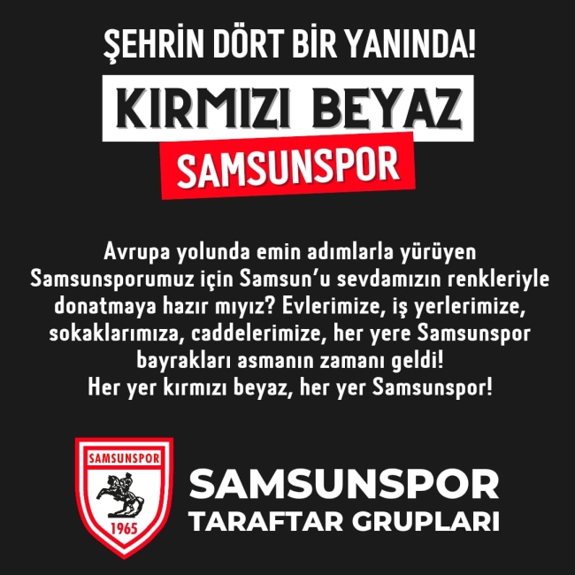 Süper Lig'de başarılı bir performans sergileyen Samsunspor'un Avrupa yolunda ilerlediğine dikkat çeken Samsunspor Taraftar Grupları, paylaşımlarında şu ifadelere yer verdi; Avrupa yolunda emin adımlarla yürüyen Samsunsporumuz için Samsun'u, sevdamızın renkleriyle donatmaya hazır mıyız? Evlerimize, iş yerlerimize, sokaklarımıza, caddelerimize, her yere Samsunspor bayrakları asmanın zamanı geldi! Her yer kırmızı beyaz, her yer Samsunspor!