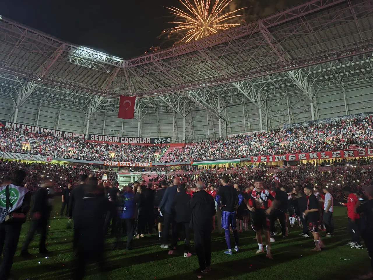 Maçın bitiş düdüğüyle birlikte futbolcular, teknik heyet ve yöneticiler taraftarlarla omuz omuza kutlama yaptı. Meşaleler yakıldı, tezahüratlar yükseldi. Samsun 19 Mayıs Stadyumu’nda yapılan lazer ve havai fişek gösterileri, sevinci katladı.