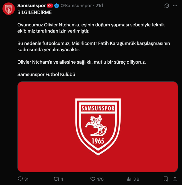 Kulüpten yapılan açıklamada, “Oyuncumuz Olivier Ntcham’a ve ailesine sağlıklı, mutlu bir süreç diliyoruz” ifadelerine yer verildi. Ntcham’ın yokluğu, Samsunspor’un orta saha rotasyonunda geçici bir değişiklik yaratacak. Teknik ekip, oyuncunun sonraki maçta kadroya dönmesini bekliyor.