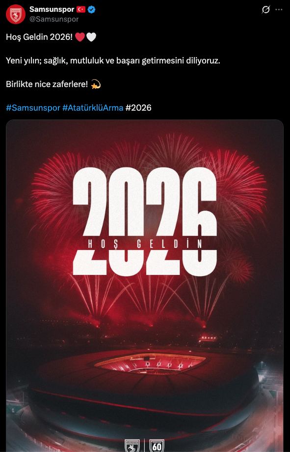 “Hoş Geldin 2026!” ifadelerine yer verilen paylaşımda, “Yeni yılın; sağlık, mutluluk ve başarı getirmesini diliyoruz. Birlikte nice zaferlere!” mesajı paylaşıldı. Samsunspor’un paylaşımı kısa sürede taraftarlardan yoğun ilgi gördü.