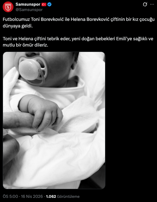 Samsunspor, futbolcusu Toni Borevković’in baba olduğu haberini duyurdu. Kulüpten yapılan açıklamada, Borevković ile eşi Helena Borevković çiftinin bir kız çocuğu dünyaya getirdiği belirtildi.