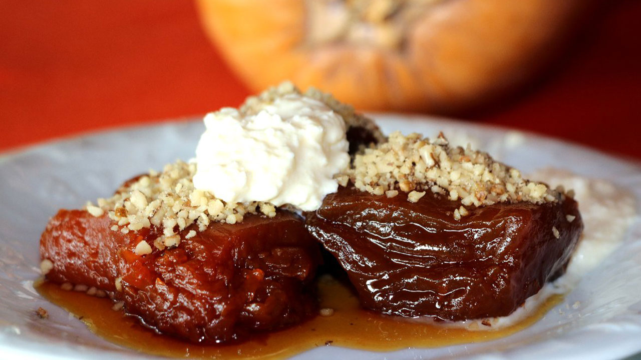 Tahinli Kabak Tatlısı: Fırınlanmış bal kabağının tahin ve fındıkla servis edilen hali.