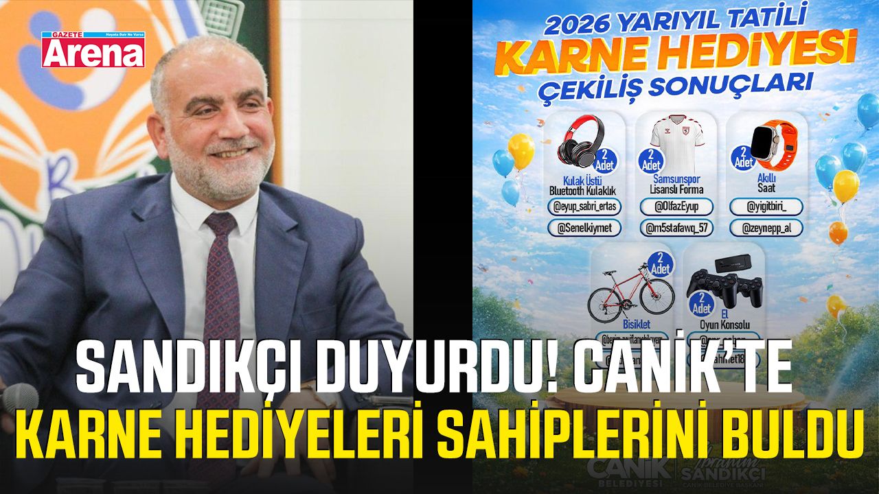 Canik Belediyesi tarafından 2026 yarıyıl tatiline özel olarak düzenlenen Karne Hediyesi Çekilişi’nin sonuçları belli oldu. Çekiliş sonuçlarını kamuoyuyla paylaşan Canik Belediye Başkanı İbrahim Sandıkçı, hediye kazanan öğrencilerin izlemesi gereken sürece ilişkin bilgilendirmede bulundu. Uygulamanın öğrencilerin yarıyıl tatiline motivasyonla girmesine katkı sağlaması hedefleniyor.