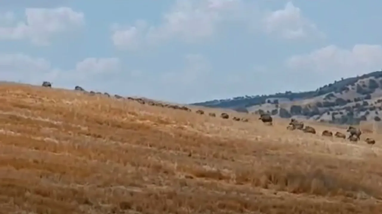 Büyük bir şaşkınlık yaşayan vatandaş, domuz sürüsünü cep telefonu kamerası ile kayıt altına aldı. Görüntülerde 60'a yakın yaban domuzunun arazide ilerlediği görüldü.