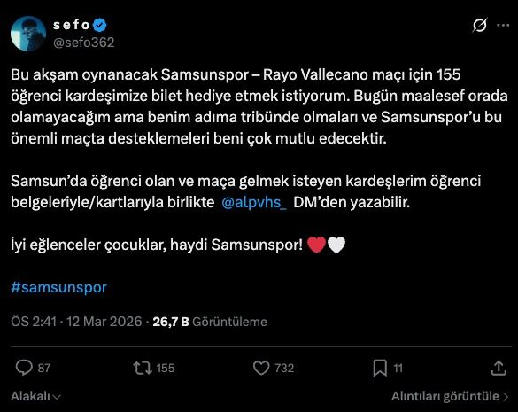 Sefo, sosyal medya hesabından yaptığı paylaşımda Samsunspor ile Rayo Vallecano arasında oynanacak karşılaşma için 155 öğrenciye bilet hediye etmek istediğini açıkladı.