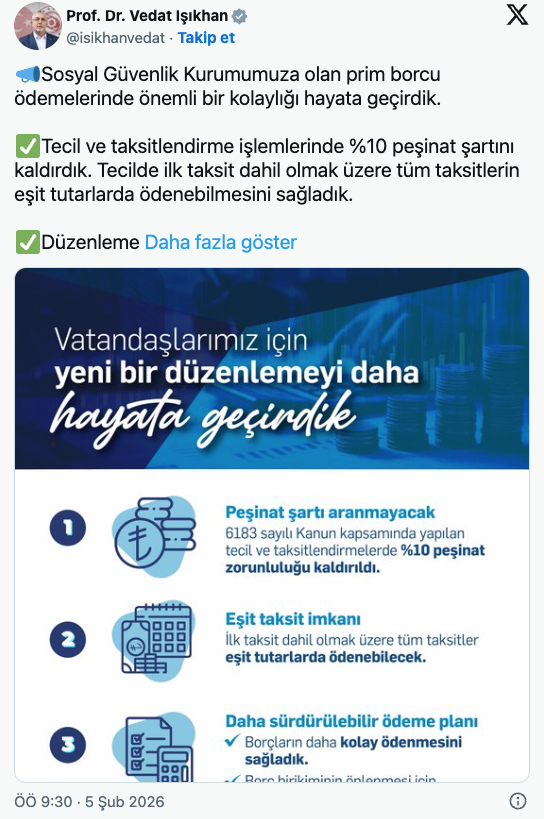 Düzenlemenin özellikle işverenler, esnaf ve kendi nam ve hesabına çalışanlar için önemli bir rahatlama sağlaması beklenirken, Bakanlık yetkilileri uygulamanın borçların düzenli şekilde ödenmesine katkı sunacağını vurguladı.