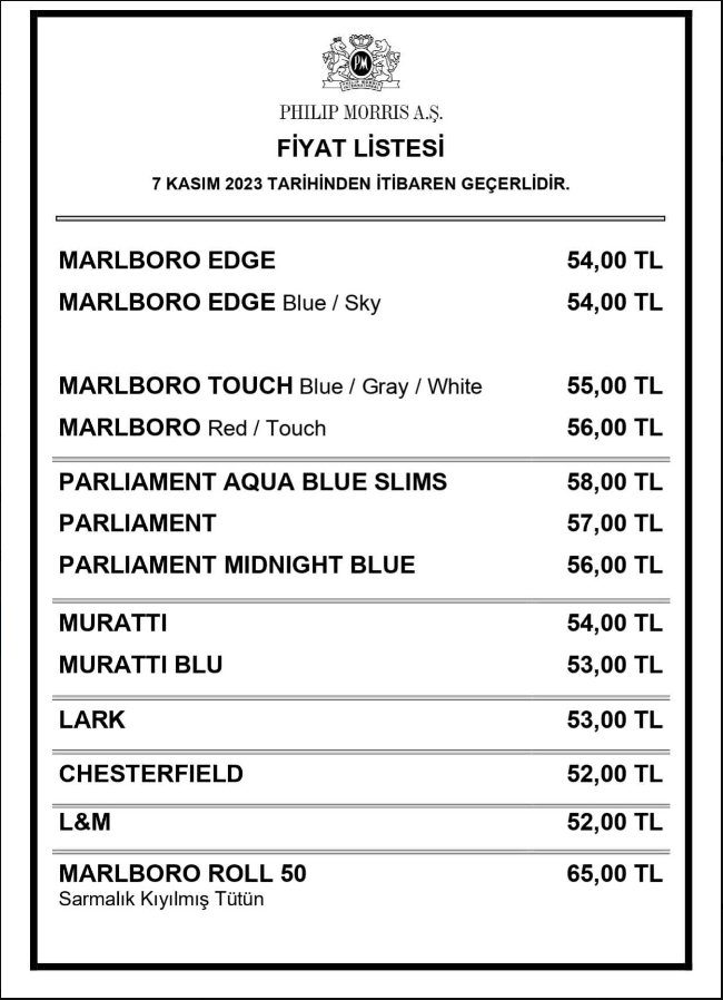 Ard arda gelen sigara zamlarından Philip Morris grubuda yayınladığı yeni fiyat listesinde en pahalı sigara 58 TL, en ucuz sigara 52 TL olarak belirlendi.