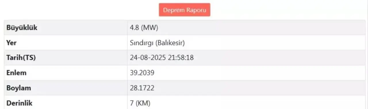 Balıkesir’in Sındırgı ilçesinde meydana gelen deprem Marmara ve Ege bölgelerinde geniş bir alanda hissedildi. AFAD’ın verilerine göre saat 21.58’de kaydedilen depremin büyüklüğü 4,8, derinliği ise yaklaşık 7 kilometre olarak açıklandı. Deprem Balıkesir merkezinin yanı sıra İzmir, Bursa ve İstanbul gibi çevre illerde de hissedildi. Kısa süreli paniğe neden olan sarsıntı sonrası bölge halkı evlerinden dışarı çıktı. AFAD ve ilgili kurumlar olayın ardından sahada inceleme başlattı.