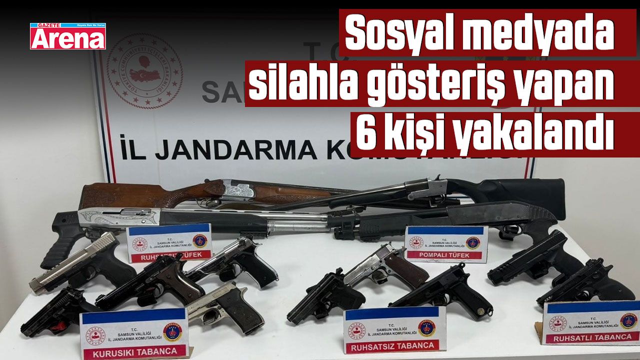Samsun İl Jandarma Komutanlığı ekipleri, sosyal medyada yaptıkları paylaşımlarda havaya ateş ederek genel güvenliği tehlikeye atan 6 şahsı tespit etti. Şahısların ikametlerinde yapılan aramalarda toplamda: 5 adet kuru sıkı tabanca, 3 adet ruhsatsız tabanca, 2 adet ruhsatlı tabanca, 1 adet ruhsatlı tüfek, 3 adet ruhsatsız tüfek ele geçirildi.