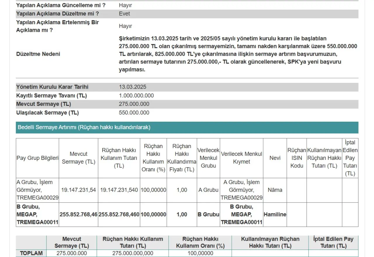 2 kez üst üste bedelli sermaye artırım başvurusu reddedilen Mega Polietilen Köpük Sanayi ve Ticaret A.Ş, bugün aldığı yeni bedelli kararının akabinde bir kez daha SPK’ya başvuruda bulundu. Güncel olarak 275 milyon TL’lik ödenmiş sermayeye sahip olan firma, 275 milyon TL’lik (yüzde 100 oranında) bedelli sermaye artırımı ile çıkarılmış sermayesini 550 milyon TL noktasına yükseltmeyi amaçlıyor. SPK’nın bu kez firmanın sermaye artırımına ne tepki vereceği ise merak konusu oldu.
