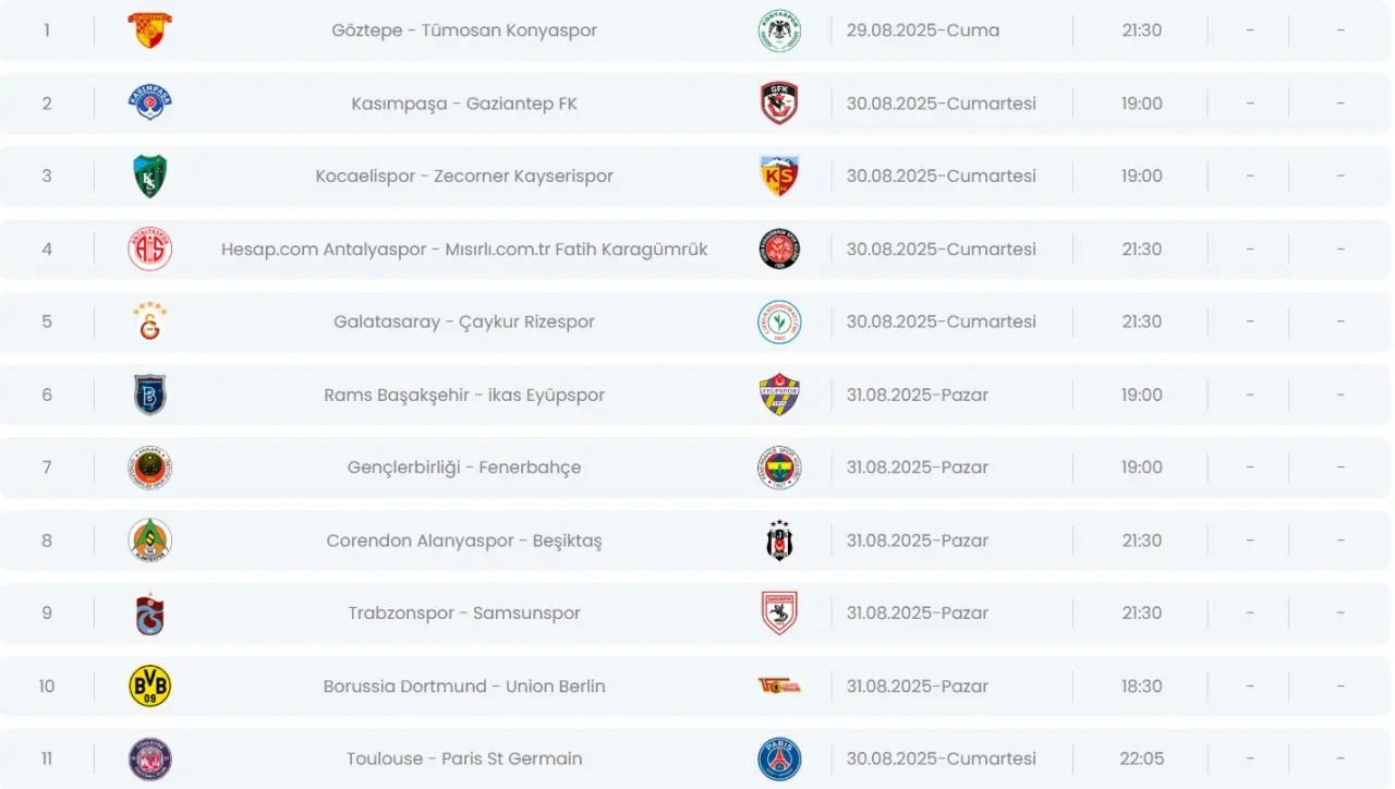 1 | Göztepe - Tümosan Konyaspor | 29.08.2025 | 21:30 |