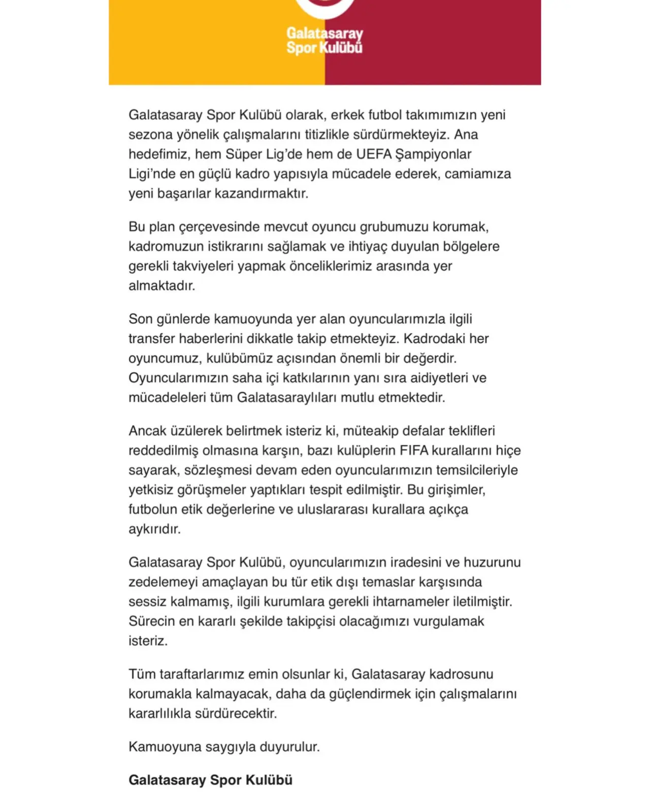 Kulüpler arası bonservis pazarlığı devam ederken, kendisinden izin almadan bonservisli oyuncusu ile görüşmesi karşısında Galatasaray tarafından NEOM’a ihtar çekildi. Bu ihtar hakkında sarı kırmızılı kulüpten dün akşam sosyal medya hesabından şu paylaşım yapıldı: