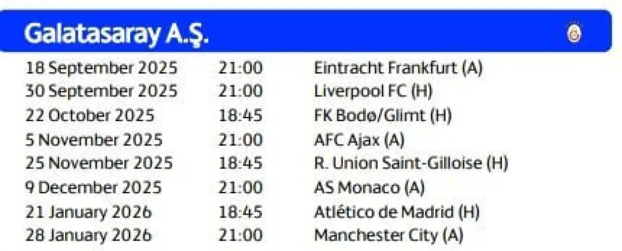 Şampiyonlar Ligi’nin yeni formatında Galatasaray, iç sahada 4, deplasmanda ise 4 karşılaşmaya çıkacak. Rakipler arasında Liverpool ve Manchester City gibi Avrupa devlerinin yanı sıra, Ajax, Atletico Madrid, Monaco ve Frankfurt gibi güçlü ekipler de bulunuyor.
