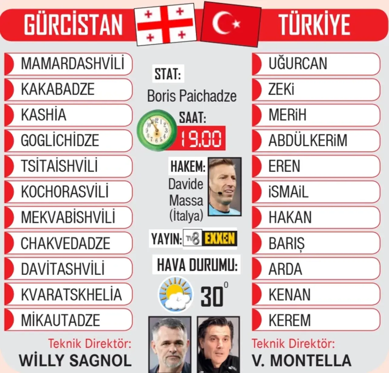Maçın hakemi İtalyan Davide Massa olacak. Yardımcılıkları Filippo Meli ve Stefano Alassio üstlenecek, 4. hakem ise Matteo Marcenaro. Ay-yıldızlılar son taktik çalışmasını dün İstanbul’da tamamlayıp 16.00’da Gürcistan’a uçtu.