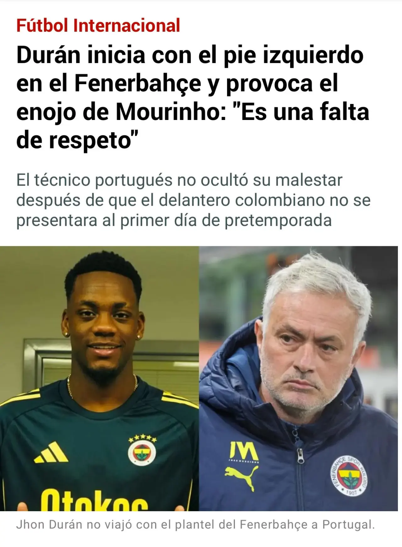 Portekiz’de kampta olan Fenerbahçe’de, henüz kampa katılmayan yeni transfer Jhon Duran hakkında teknik direktör Jose Mourinho’nun açıklamalarda bulunduğu iddia edildi. Akabinde hem Mourinho’dan ve hem de Fenerbahçe’den yalanlama geldi. Marca da yayımladığı haberi internet sitesinden kaldırdı; işte detaylar…
