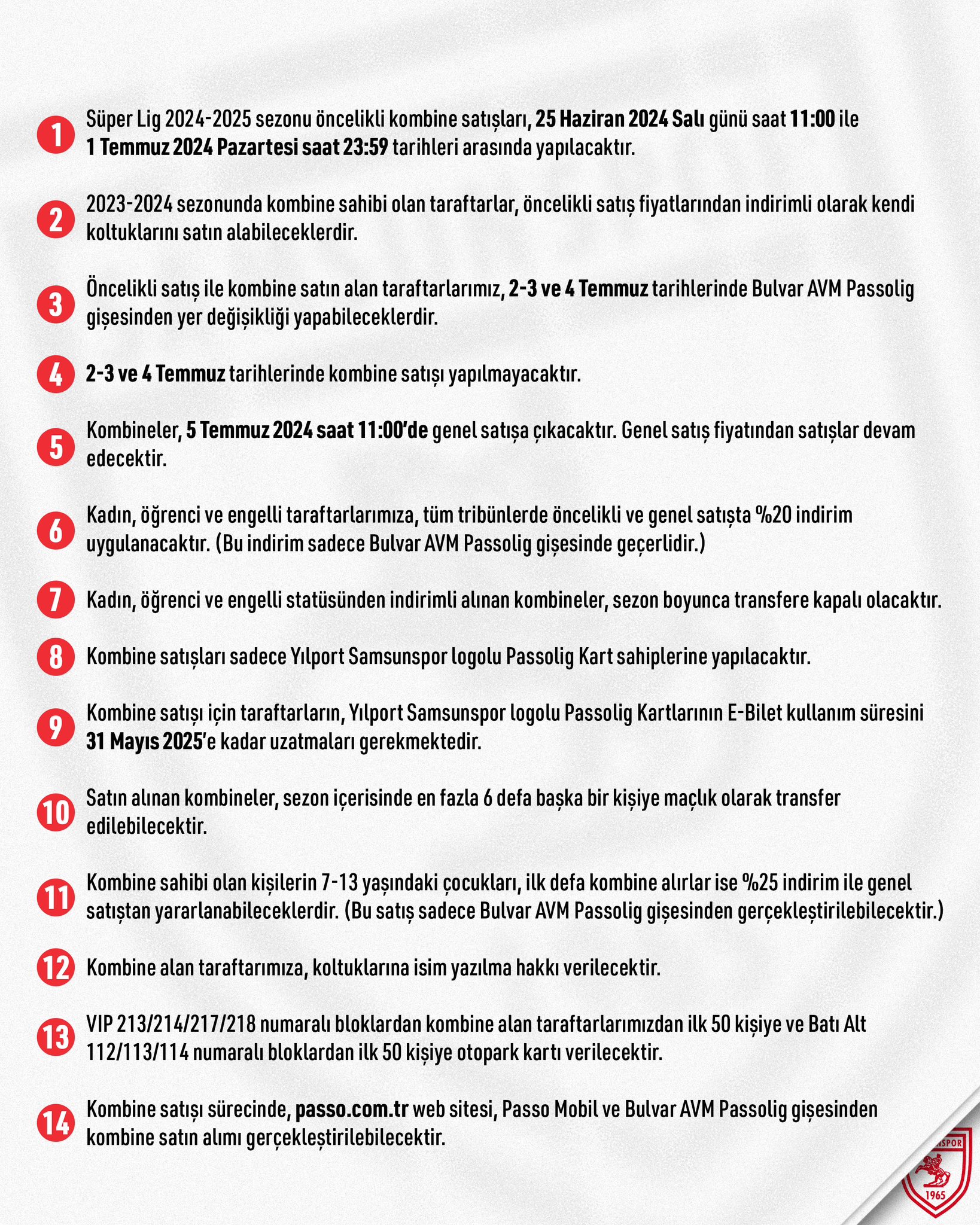 Trendyol Süper Ligi ekiplerinden Samsunspor'da 2024-2025 sezonu kombine bilet fiyatları açıklandı.