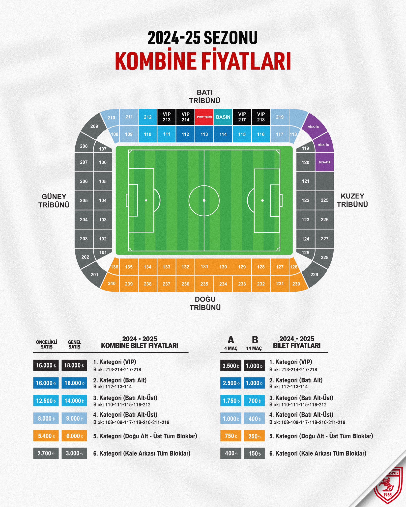 Açıklanan kombine fiyatları öncelikli satışta Batı Alt 112-113, Vip Tribün 16 Bin TL ve 114. bloklar 16 bin TL, Batı Alt- Üst 110-111-115-116 ve 212 nolu bloklar 12 bin 500 TL, Batı Alt- Üst 108-109-117-118-210-211 ve 219 bloklar 8 bin TL, Doğu Alt- Üst 5 bin 400 TL, Kale arkası Tribünleri de 2 bin 700 TL olarak belirlendi.