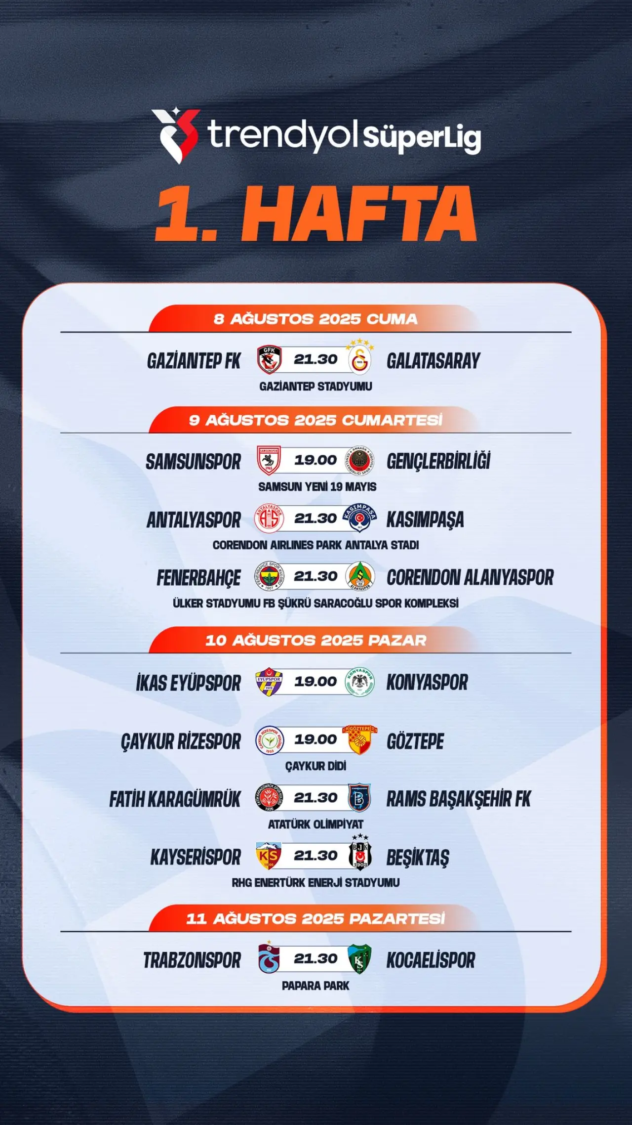 Yeni sezon 8 Ağustos 2025 Cuma günü saat 21.30’da Gaziantep FK - Galatasaray maçıyla başlıyor.