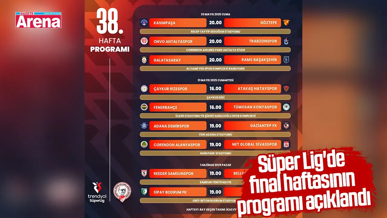 Trendyol Süper Lig’de 38. ve son hafta maç programı belli oldu. Türkiye Futbol Federasyonu (TFF), 2024-2025 sezonunun kapanış haftasına dair maçların tarih ve saatlerini açıkladı.