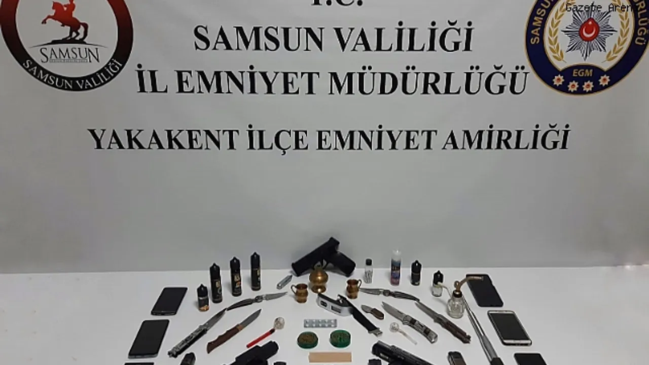 İlçe Emniyet Amirliği ekiplerince şüpheli bir araçta ve araçta bulunan 2 şahsın üzerinde yapılan aramada, 2 adet ruhsatsız tabanca, 1 adet havalı tabanca, 1 adet polis rozeti, 3 adet tarihi eser olduğu değerlendirilen obje, 1 adet uyuşturucu madde sarma kağıdı (çarşaf), 2 adet elektronik sigara ve 7 adet likit, 3 adet uyuşturucu kullanım aparatı (payp), 1 adet içerisinde bir miktar esrar bulunan esrar öğütme aleti, 1 adet teleskopik cop, 1 adet elektronik terazi, 7 adet bıçak, 8 adet sentetik ecza ele geçirildi. Gözaltına alınan Ş.A.(37) ve H.T.E.(24), TCK 188’den, 6136 SKM’den, 2863 SKM’den ve TCK 264 SKM (Özel İşaret ve Kıyafetleri Usulsüz Kullanma) suçlarından soruşturma başlatıldı. Şahıslara ait 6 adet cep telefonuna el konuldu.