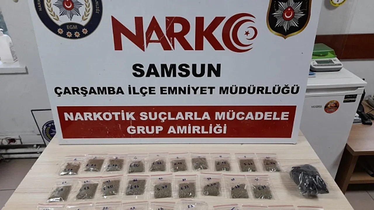 Edinilen bilgiye göre, Çarşamba Cumhuriyet Başsavcılığınca yürütülen soruşturma kapsamında, Çarşamba ilçesi Orta Mahalle'de İlçe Emniyet Müdürlüğü Narkotik ekiplerince şüpheli bir araç durduruldu. Araç içerisinde arama yapıldı. Yapılan aramada satışa hazır 25 parça halinde yaklaşık 141 gram esrar maddesi, 1 adet mermi ve 3 adet bıçak ele geçirildi. Ayrıca şüphelilerin üzerinden yaklaşık 5 gram esrar maddesi ve alüminyum folyaya sarılı yaklaşık 3 gr metamfetamin maddesi ele geçirildi.