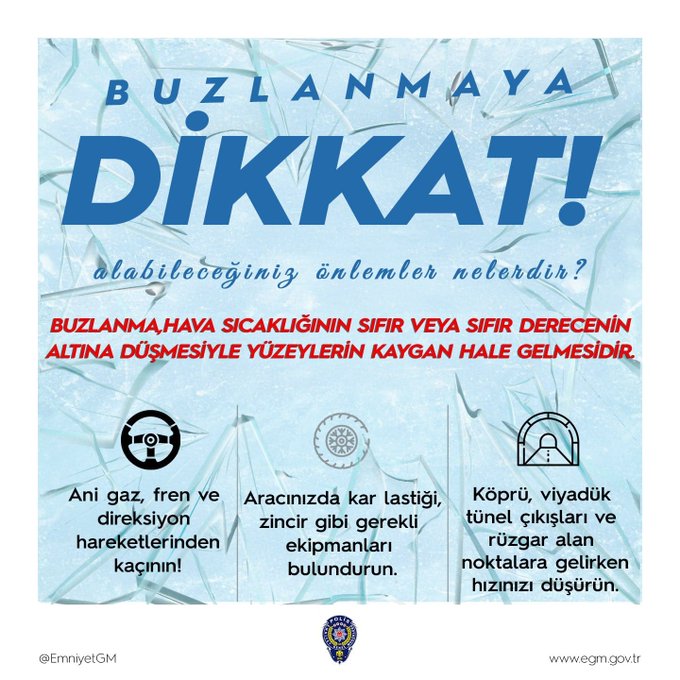 Özellikle köprü, viyadük, tünel çıkışları ve rüzgâr alan bölgelerde buzlanmanın daha yoğun görülebileceği belirtilirken, bu noktalara yaklaşırken hızın düşürülmesi istendi.