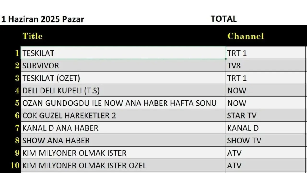 1 HAZİRAN 2025 PAZAR TOTAL REYTİNG SIRALAMASI