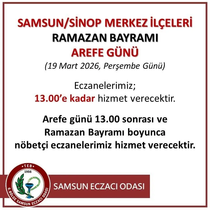 Samsun Eczacı Odası'nın duyurusuna göre, 19 Mart 2026 Perşembe günü Arefe günü olması sebebiyle eczaneler saat 13.00’e kadar tam kapasiteyle açık kalacak. Bu saatten itibaren rutin çalışma düzenine ara verilerek nöbetçi eczane uygulamasına geçiş yapılacak. Vatandaşların mağduriyet yaşamaması için acil ilaç ihtiyaçlarını öğle saatinden önce tamamlamaları öneriliyor.