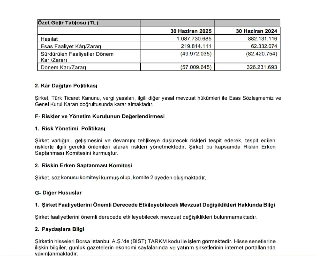 Tarkim Bilançosu 2025/6 Bilançosu Zarar Yazdı!