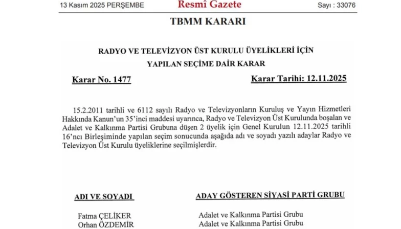 Resmî Gazete’de yer alan karara göre, AK Parti Grubu’na düşen iki üyelik için yapılan seçimde Fatma Çeliker ve Orhan Özdemir RTÜK üyeliğine getirildi. Seçimler, 6112 sayılı Radyo ve Televizyon Kuruluş ve Yayın Hizmetleri Hakkında Kanun’un 35. maddesi kapsamında gerçekleştirildi.