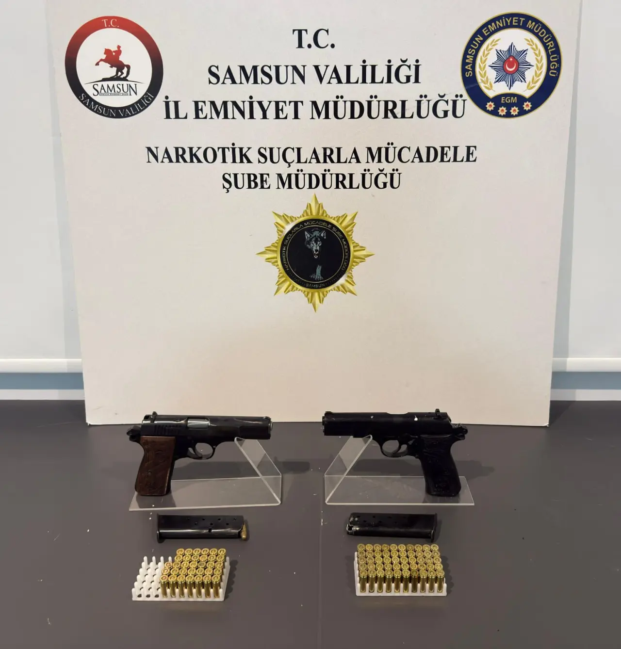 Yapılan aramalarda, 2 adet ruhsatsız tabanca ile 85 adet tabanca fişeği ele geçirildi.