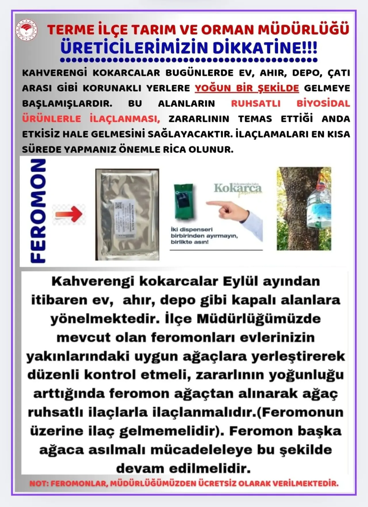Terme İlçe Tarım ve Orman Müdürü Tuncay Demir, kahverengi kokarca böceğine (Halyomorpha halys) karşı üreticileri önlem almaya çağırdı. Demir, yaptığı açıklamada, havaların soğumasıyla birlikte kahverengi kokarcaların ev, ahır, depo ve çatı arası gibi kapalı alanlara girmeye başladığını belirtti.
