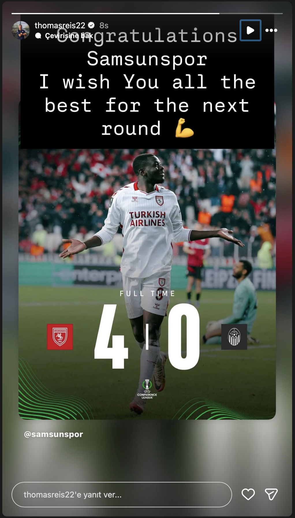 Karadeniz temsilcisinin eski teknik direktörü Thomas Reis, sosyal medya hesabı üzerinden yayınladığı paylaşımda Samsunspor'u bu başarısından dolayı tebrik ederek Son 16 Turu için başarı dileklerinde bulundu. Reis, paylaşımında eski takımının ulaştığı seviyeye vurgu yaparak başarılarının devamını dilediğini ifade etti