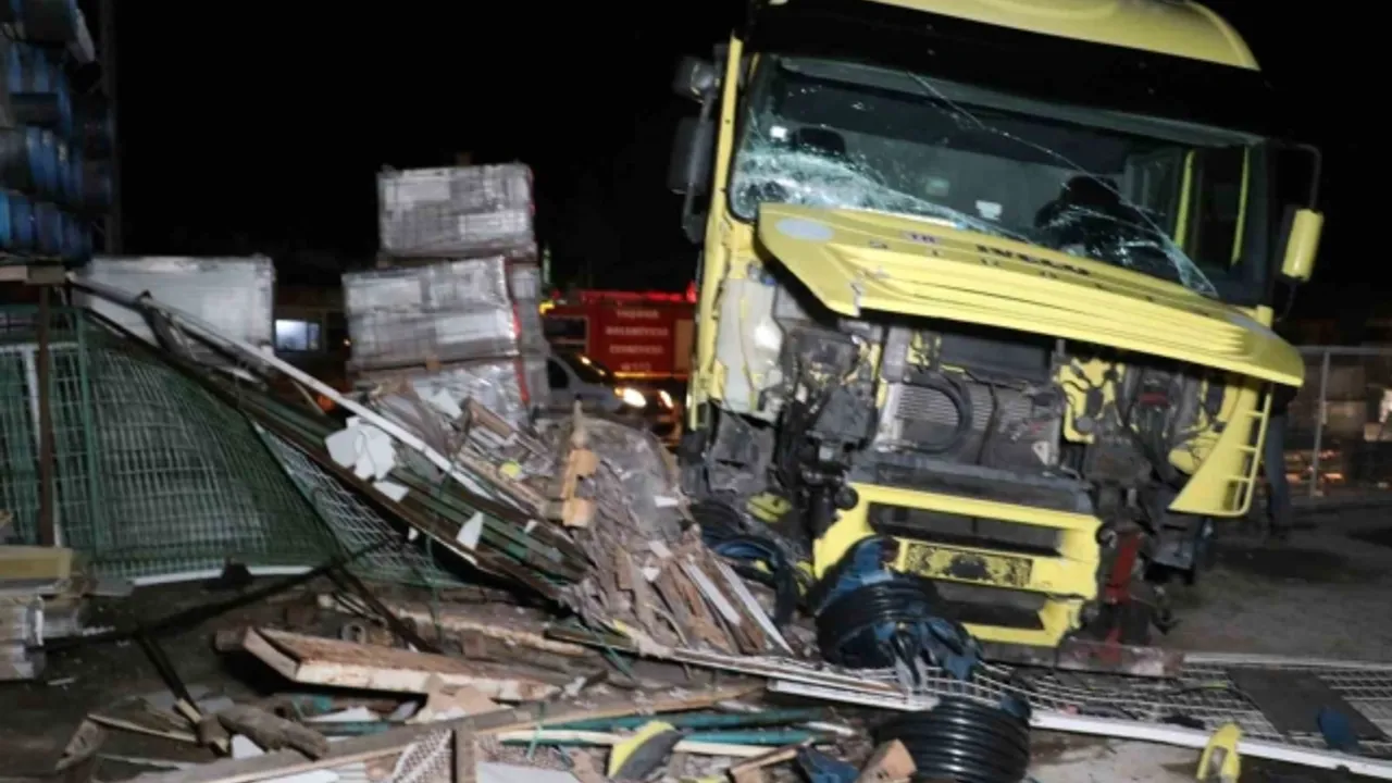 Amasya'nın Taşova ilçesinde inşaat malzemeleri satılan bir iş yerine dalan tır kameraya yansıdı. Kazada, iş yerinin önünde satışa sunulan ürünler, palet üzerinde yüklü fayanslar ve inşaat malzemeleri çevreye saçıldı.