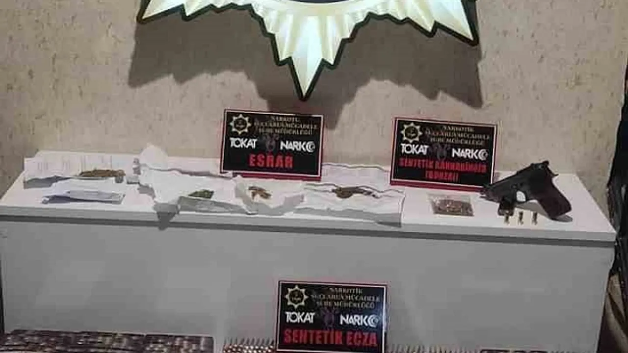 Tokat İl Emniyet Müdürlüğü, Narkotik Suçlarla Mücadele Şube Müdürlüğünce uyuşturucu madde imal ve ticareti suçlarına yönelik yapılan çalışmalar sonucunda, Tokat Merkez'de iki araç şüpheli görülerek durduruldu. Araçlarda ve sonrasında ikametlerde yapılan aramalarde 3 bin 814 adet sentetik ecza hap, 26,94 gram esrar, 5,88 gram bonzai, 1 adet ruhsatsız 7,65 mm tabanca, 1 adet şarjör, 3 adet 7,65 çapında fişek ele geçirildi. Olayla ilgili olarak iki şüpheliye "Uyuşturucu Madde Ticareti Yapmak" suçundan adli işlem başlatıldı. Emniyet de tamamlanan işlemlerin ardından adliyeye sevk edilen şüphelilerden biri adli kontrol kararı ile serbest bırakıldı, diğer şüpheli ise tutuklanarak cezaevine teslim edildi.