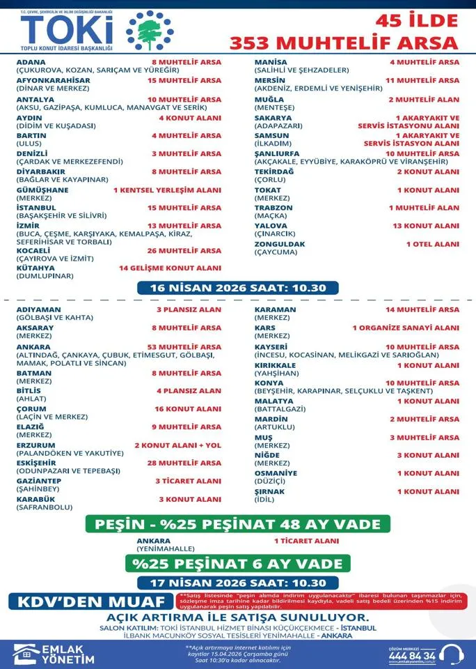 Taşınmazların satışına yönelik açık artırmalar 16-17 Nisan 2026 tarihlerinde, saat 10.30’da başlayacak. Müzayedeler Ankara İlbank Sosyal Tesisleri ile TOKİ İstanbul Hizmet Binası’nda fiziki olarak yapılacak. Açık artırmaya katılmak isteyen yatırımcılar, https://www.google.com/search?q=emlakyonetim.com.tr üzerinden de çevrimiçi ortamda teklif sunabilecek.