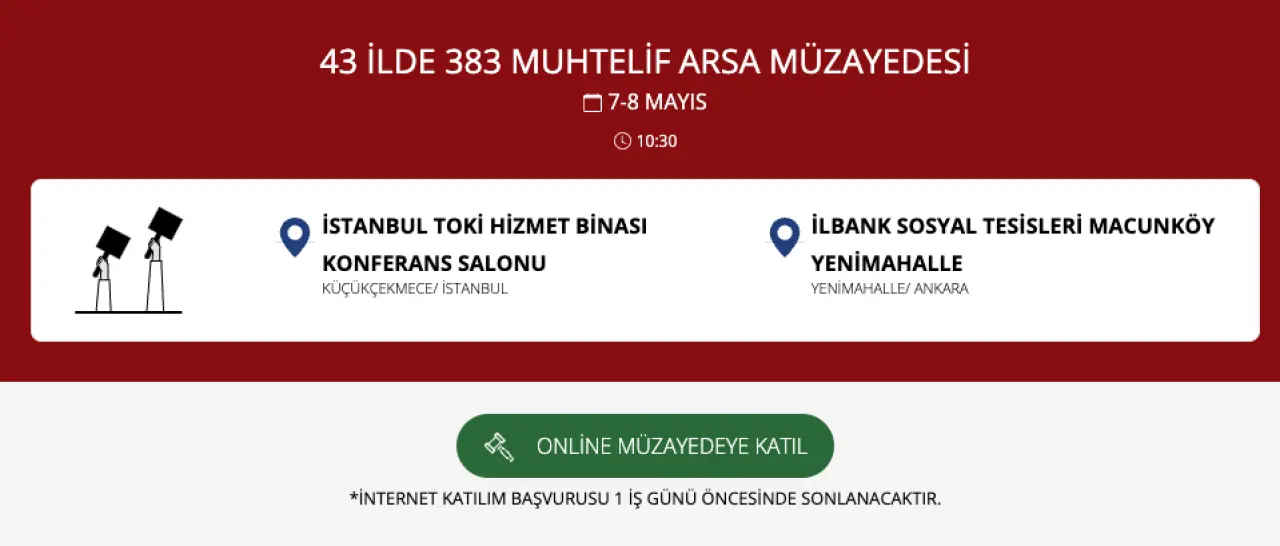 TOKİ’nin arsa müzayedeleri, 7-8 Mayıs 2025 tarihlerinde saat 10.30’da başlayacak. Fiziki katılım İstanbul’da TOKİ Hizmet Binası Konferans Salonu’nda, Ankara’da ise İlbank Sosyal Tesisleri Macunköy Yenimahalle’de yapılabilecek. Dileyenler, Emlak Yönetim Hizmetleri ve Ticaret A.Ş. üzerinden online olarak da müzayedeye katılabilecek.